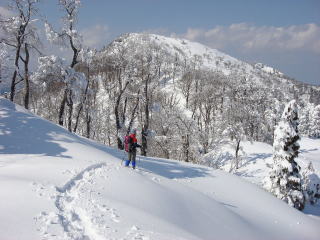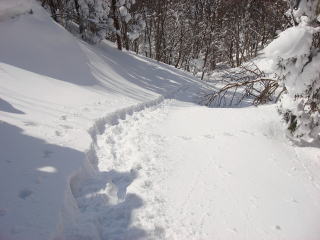 昨日降った30cmほどの新雪でスノーシューでも沈み込むが、先行者のトレースのお陰で楽に歩ける。