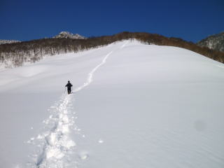 トレースがあり、30cmの新雪はスノーシューをうまく受け止めてくれて難なくトラバース出来そうなので進ん