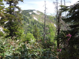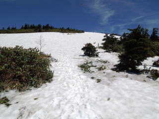 木の間から山頂付近が垣間見え、残雪が多くなっていく。踏み跡をたどればアイゼンはいらない。