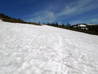 「山頂まで2,2km」の標識あたりから針葉樹林に変わり、次第に残雪の道になっていく。