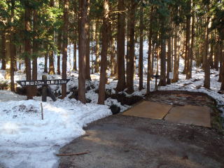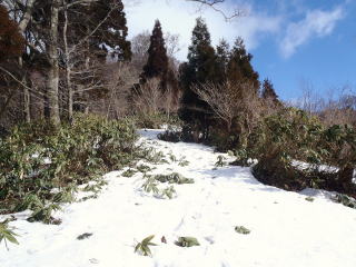 | 40分ほど登るとようやく雪道になった。ヤレヤレ。 | |