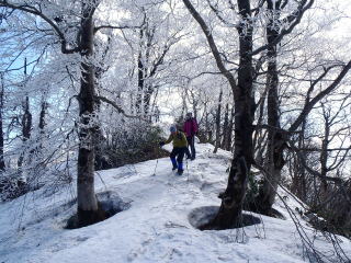 | 白馬山から毛無山に向かって歩いて行くと、次第に樹々が白くなってき、待望していた樹氷ロードになった。 雪が薄いのでツボ足で問題なく歩ける。 |