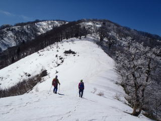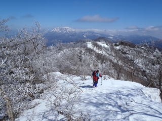 | 前方に毛無山を見ながら、雪庇の張り出したヤセ尾根を歩いていく。 | |