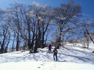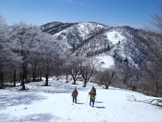 | 駐車場に着いたときはあまりの雪の少なさに驚いたが、尾根に上がるとまだまだ雪山だった。 穏やかな日差しと真っ青な空の下、春の雪山を堪能することができた。 |