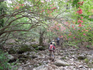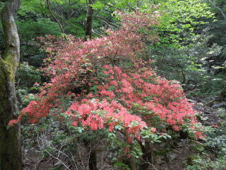 | 朱紅色のアマギツツジが咲き、つるつる肌のヒメシャラが目につく森を歩いて行く。 | |