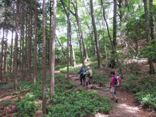 | 林床がコアジサイの小さな木に覆われた道を登っていく。アマギツツジが森を明るくしてくれる。 | |