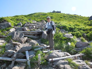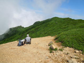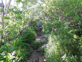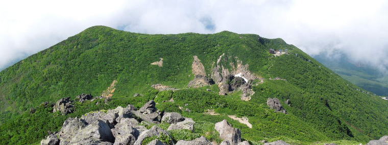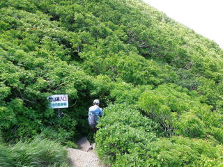 | 樹林帯にを登っていくと、30分で鳥海山と岩手山の鞍部に到着し、ここからは視界が開ける。 | |||