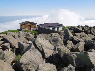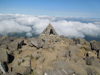 | 8時30分:大きな石で敷き詰められた岩木山山頂に到着。 天気はいいが、雲海が広がっていて残念ながら景色は見えなかった。 |