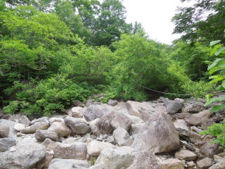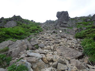 | 打石(ぶついし)を過ぎるとロープ場が現れる。 これを登るのかと気合を入れかけたが、右手に巻き道があったので迷わずそちらへ行く。 |