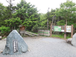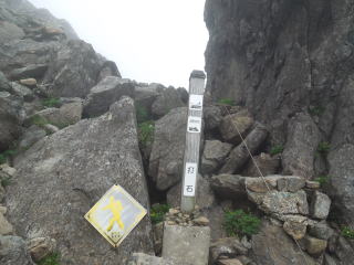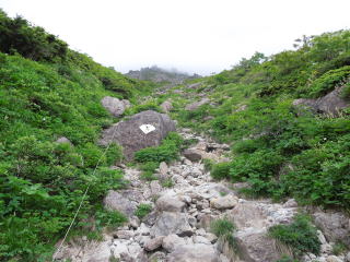 | 6時20分:五座走りの標柱地点に到着。この辺りから急傾斜のガレ場が山頂まで続く。 | |||