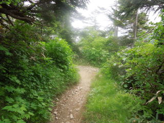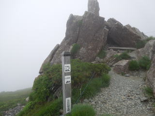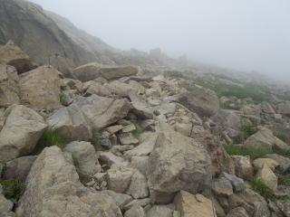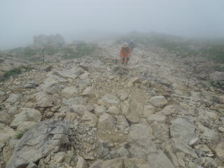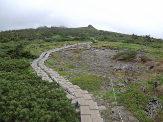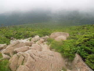 | 7時40分:小田越へ向かって出発。 一瞬ガスが晴れると、岩を配した草原と、その間に木道が続いているのが見渡せた。 河原の坊ルートと違ってこちらは広々とした感じだ。 |
