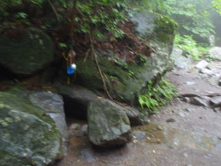 | 滑りやすい岩の道を慎重に登っていく。10時5分、男女川源流の水場を通過。 | |