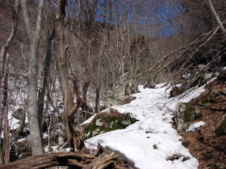 | 登山道に入るといきなり50センチ位の雪道。雨のせいかゆるゆるでズボズボと足が入り込む。 先行の人はどこを登っているのだろう?足跡がない。 しかも沢沿いの道が続き岩が多く足場が悪いので、ワカンがつけられない。 雪は深くなり1メートル近いところもある。 |