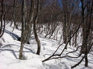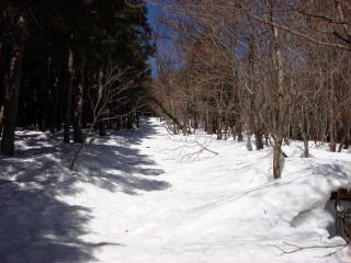 | 船木山の斜面を滑り降りる。 下りは早い。 15時20分:下山の目途がついたので 沢筋に 入る手前で昼食。 味噌汁がうまい! 16時30分:登山口に到着。やれやれ。 16時50分:駐車地点に到着。 深山の春はもう少し先のようだ。 |