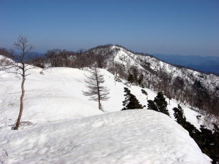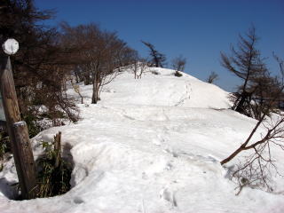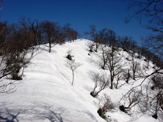| そろそろタイムリミットだが、尾根道は雪が締っていて歩きやすい。 30分ぐらいで後山に行けそうだ。スノーシューの跡をなぞって快調に進んでいける。 |