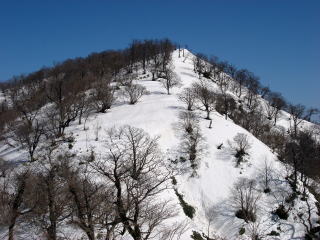 | 13時40分:ついに縦走路に到着。 そこでスノーシューを履いた兄ちゃんと出会った。どうやら先に1台駐車していた人のようだ。 聞くと駒の尾山から登り、後山まで行ってきたとのこと。元気印の人だ。 縦走路に出るといっきに視界が開けた。雲一つない青空に真白な尾根が続く。 去年来た時にはクマ笹の道だったが今日は何もない。真っ白だ。 |