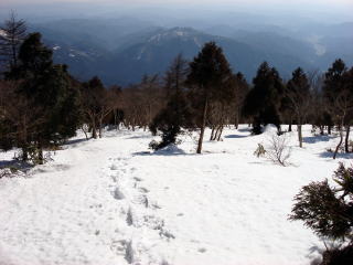 | 山の日暮れは早いので、あまりゆっくりとしておれない。 14時35分:下山開始。スノーシューの大きな足跡をたどっていく。 船木山でもう一度、氷ノ山と那岐山を仰ぐ。 |