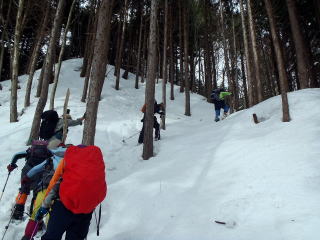 15分ほど歩いて、若杉原生林駐車場手前の尾根から取り付く。