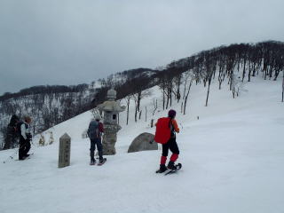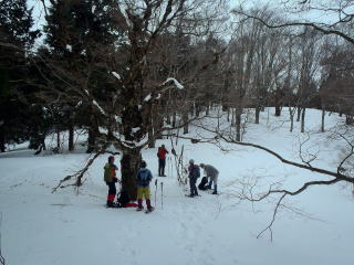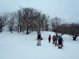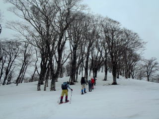 風雪に耐えたブナ林の広い尾根を気持よく歩いて行くと、13時30分、林道完成記念碑前に到着。