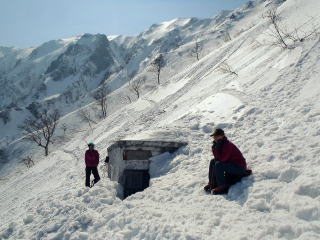 | 頂上避難小屋も半分埋まっていた。 ドサリと音がするので見上げると、屋根に張られたワイヤーに付いていた霧氷が溶け落ちる音だった。 |