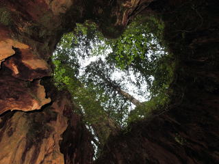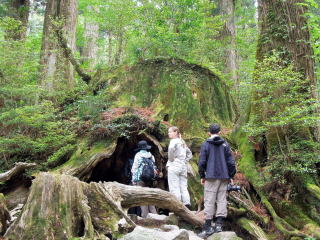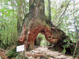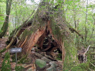 | 8時15分:縄文杉から1時間余下ると屋久島で一番の巨木だったというウイルソン株。 ガイドブックに必ず載っている、切り株の中からのハートマークのアングルで写真撮影。 |