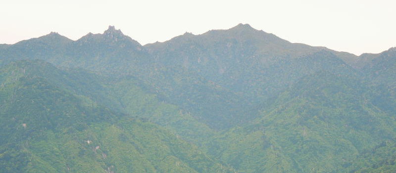 | 岩に上がると、目の前に双耳峰の宮之浦岳が聳えていた。 | |