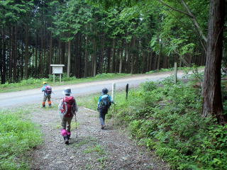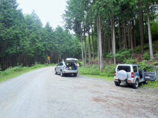 | yamayaさんのヒマ山隊6人で出かけた。 登山道の案内標識のある交差点を右折し、林道を上がっていくと出てきた登山口標識の手前に駐車。 |