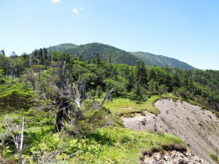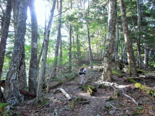 易老岳山頂から樹林の尾根道を鞍部まで下っていくと、樹林が途切れ前方に光岳らしきピークが見えた。