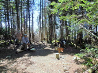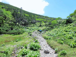 13時:ガレ道を登り切ると急に視界が開け、水場のある静高平に到着。