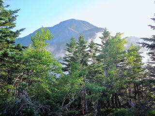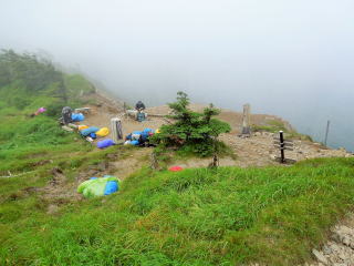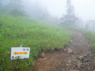 | 南側の光岳から上河内岳までの稜線も見たかったが、残念ながら雲に阻まれて見ることが出来なかった。 8時:風が強くて長居できないので下山開始。 9時40分:標高約2400mの薊畑まで降り、分岐を「西沢渡」の標識の方へ進むと、直ぐにシラビソの樹林帯になった。 |