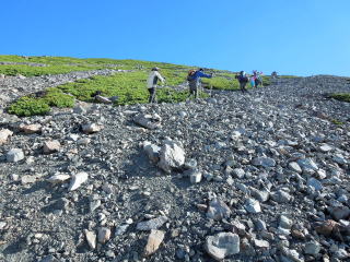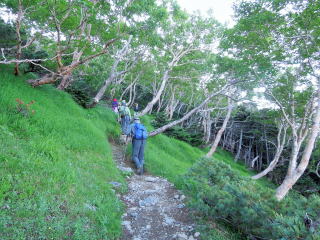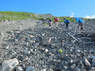 | ダケカンバの林を抜けると森林限界になり、強風に耐えながらガレ道を登っていく。 | |||