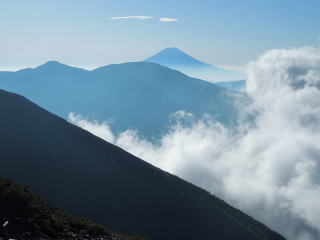 | 6時30分:小聖岳に到着。富士山も顔を見せてくれた。 | |||