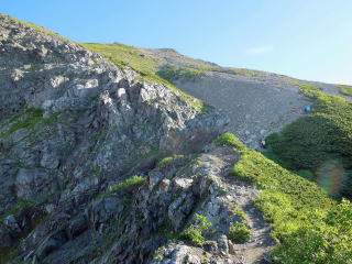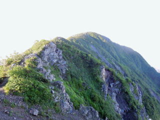 | しばらく切り立った痩せ尾根が続き、強風にバランスを崩さないよう慎重に歩を進める。 | |||