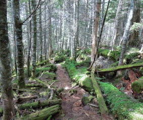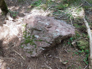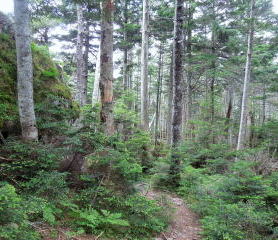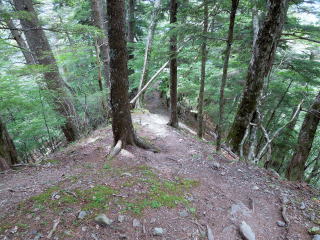 | シラビソ林の道を下っていく。赤石山系の名のとおり、赤い石が多いのが目につく。 | |||