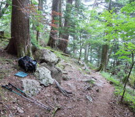 | 標高1800mまで下ってから適当場所で昼食休憩し、少し歩き始めると突然の豪雨になったが、30分で止んでくれた。 | |||