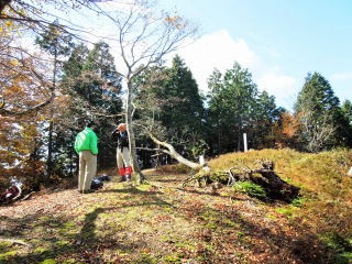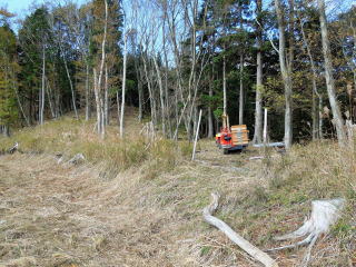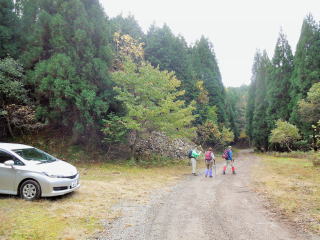 | 三久安山北尾根は、以前から紅葉時期に歩こうと思っていた。 10月下旬に狙いを定めて日を設定し、IHさん、Hさん、Fさんと4人で出発。 10時:藤無山登山口前の空地に駐車して取り付き点に向かう。 すでに標高は870m地点なので山頂までの高低差は250mしかない。 10分ほど歩いて取り付き点に着くと、入口に車が停まっていて、ススキが伐採されていた。 11月末まで工期の標識があり、どうやら植樹やフェンスを設置するらしい。 |