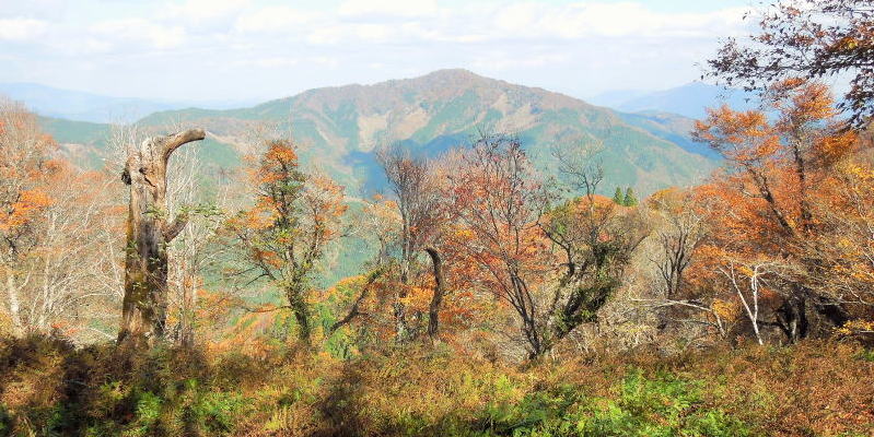 | 山頂近くの樹林が薄いところから藤無山が見えた。これがほとんど唯一の見晴だった。 | |