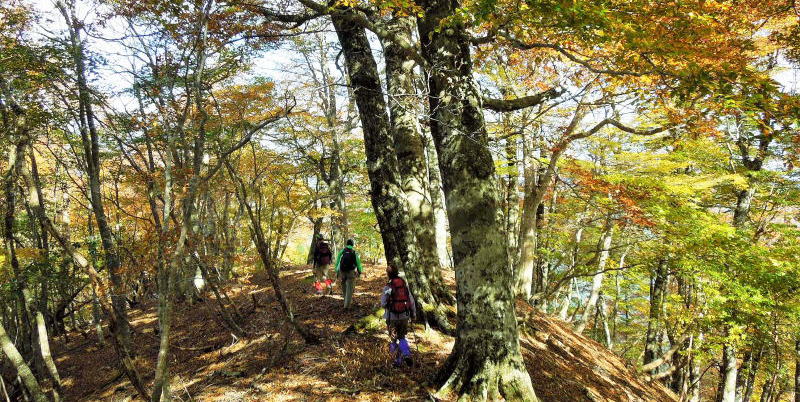 | 一度下り、今度は1012mピークに向かって、鮮やかな色彩に彩られた、落ち葉でフワフワの絨毯道を登っていく。 勾配も適度なので、散策気分で歩ける。 |