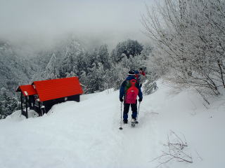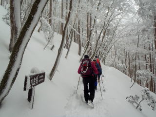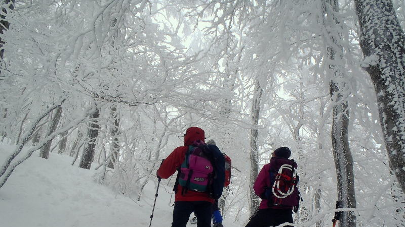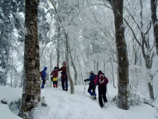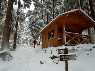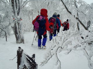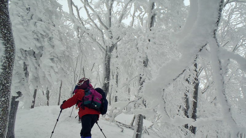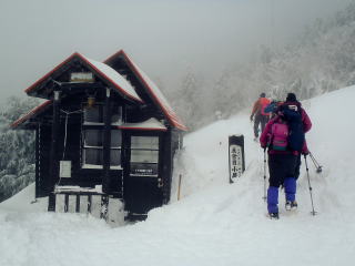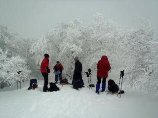| 9時20分:標高約820m地点の五合目小屋に到着。このあたりから霧氷の付いた自然林が現れ始める。 | |