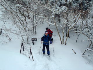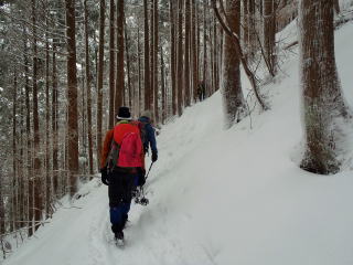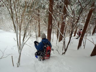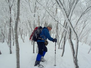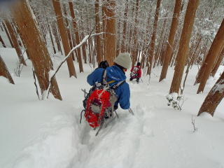 | 13時40分:五合目からは奥ノ平経由で下山する。 途中からトレースのない急坂になり、太ももまで埋まりながらラッセル。 |