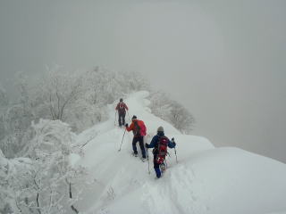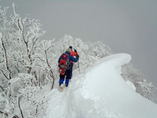 | 雪庇が張り出した痩せ尾根を通る。 | |