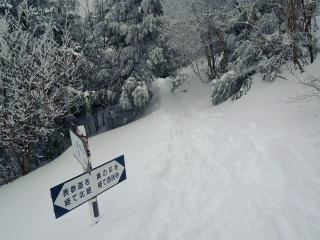| 12時50分:昨夜の積雪でトレースがなくなった竜王山経由の下山はキツそうなので諦め、同じ道を下山する。 | |