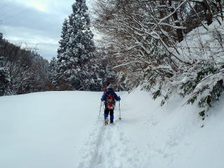 | 14時:奥ノ平に降り立ち、林道を下っていく。 | |