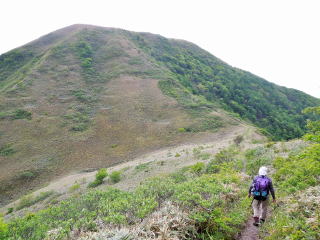 | 標高約860mまで下り、標高差100mを登り返す。振り返ると、男三瓶が雄々しい。 | |||