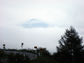 | 24日には蓼科山に登った。 蓼科山は諏訪湖の東、八ヶ岳の北側にそびえる 2530mの山だ。 諏訪富士と言われる端正な姿をし、100名山に 選ばれている。 写真は昨日霧ケ峰から写したもので、残念な がら霧に覆われてシルエットしか見えなかった が確かに富士山のように端正だ。 標高1900mの所に7合目駐車場があり、ここ から登ると高低差は600m位で2時間くらいで登 れる。 夜には家に帰るつもりなので、一番短いこのコ ースで登ることにした。 |