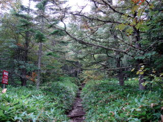 | しばらくは針葉樹の中のクマ笹の緩やかな登り道が続く。 | |