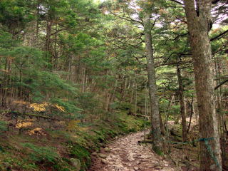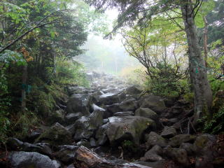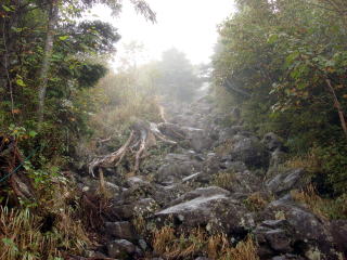 | あと高低差180mの登りだが、ここからが急登だ。大きな石の上を足場を確保しながら渡っていく。 しかし、こういう道は足場の確保に意識が集中するので案外面白い。 |