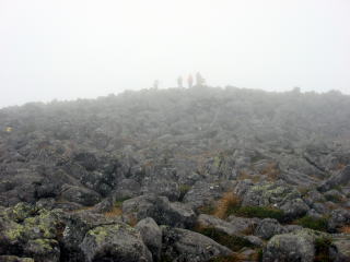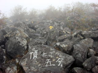 | さらに5分後に頂上に到着。頂上は野球が出来るほど広いが岩しかなかった。 天気が良ければ八ヶ岳をはじめ、北アルプス、中央アルプス、南アルプスのすべてが見えるらしいが、全く 見えないのが残念だった。 |