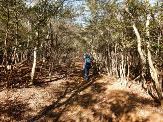 | 落ち葉でふわふわした尾根を気持ちよく下っていく。 | |