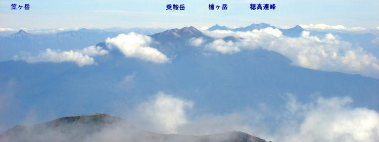 | 北側に北アルプスの槍ヶ岳、穂高岳が見える。 | ||||